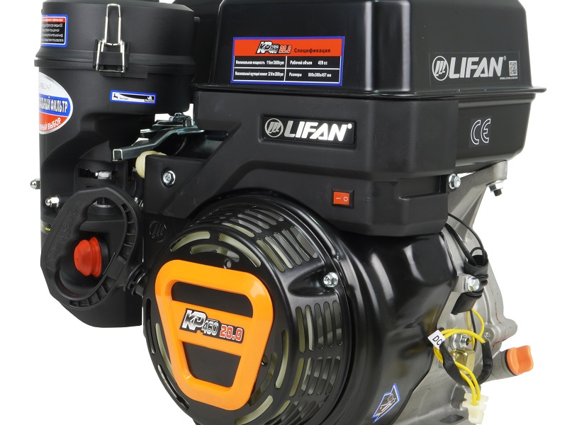 Бензиновый двигатель Lifan KP460 11А (фильтр "зима-лето") разработан для установки на различную технику бытового применения. Эта модель сочетает в себе долговечность и экономичность с умеренной стоимостью и простотой в использовании. Дополнительно оснащен катушкой 11 Ампер, которая позволяет подключать полезное электрооборудование мощностью до 140 Ватт. Четырехтактный одноцилиндровый двигатель внутреннего сгорания. Рабочий объем цилиндра составляет 460 кубических сантиметров. Коленчатый вал имеет горизонтальное расположение. Крутящий момент достигает 32 Н.м при 2880 оборотов в минуту, при этом сохраняется высокая стабильность работы и небольшой расход бензина. Емкость топливного бака равна 6,5 литров, одной заправки достаточно для длительной непрерывной работы. В качестве смазки используется доступное и известное каждому автомобилисту моторное масло 10х30, 10х40, для одной заправки маслом требуется не более 1.1 литра. Транзисторная система зажигания проста в обслуживании и долговечна, она способствует стабильной работе двигателя при любых условиях. Двигатель Lifan KP460 обладает массой в 31,9 кг. Его простая конструкция не создаст проблем при установке или при обслуживании, использование эффективного воздушного охлаждения позволяет активно использовать мотор даже в жаркую погоду. Данная модель двигателя оснащена воздушным фильтром "зима-лето", который имеет три режима работы. Главное отличие данного фильтра - в способе забора воздуха. В режиме "ЛЕТО" холодный воздух поступает снаружи. В режиме "ЗИМА" в воздушный фильтр поступает теплый воздух от глушителя. Режим "OFF" полностью закрывает воздушный фильтр, предотвращая попадание пыли, влаги, снега и т.д. Он используется на период хранения (консервации). На данном двигателе имеется праймер для легкого запуска двигателя, производительная крыльчатка, которая позволяет отводить тепло на 30% эффективнее и новая головка цилиндра с V-образным расположением клапанов для повышения качества топливной смеси. Особенность этого двигателя — шатуны на вкладышах. Преимущества двигателя Lifan KP460: -Двигатель 4х тактный, одноцилиндровый, OHV, горизонтальный вал, воздушное охлаждение. -Зажигание электронное. -Система запуска ручной старт. -Легкий пуск, система декомпрессии.