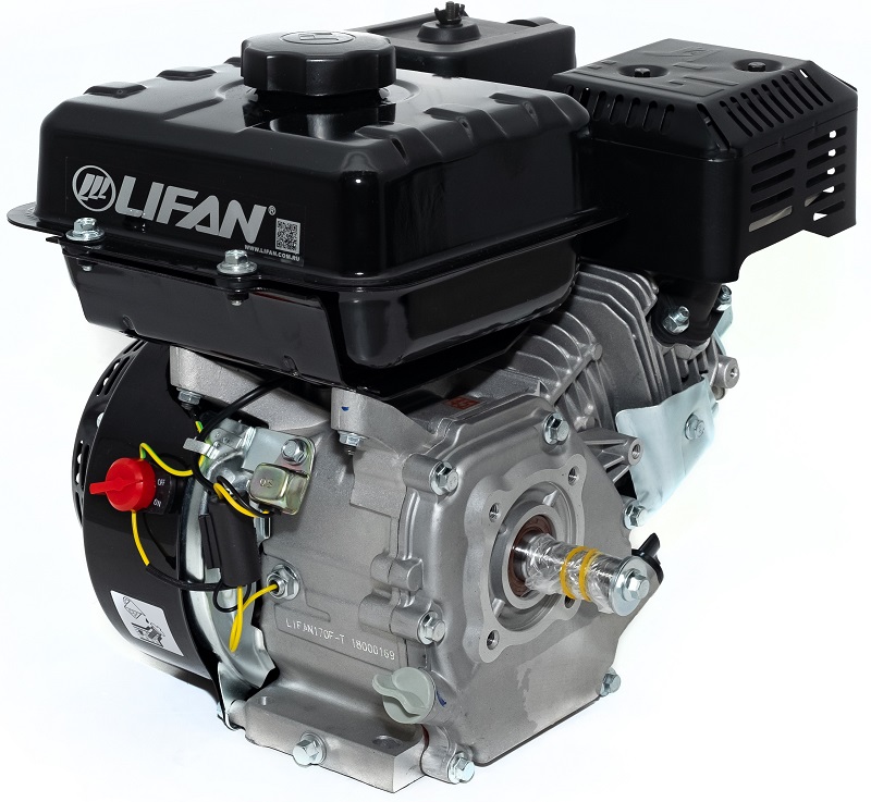 Бензиновый двигатель Lifan 170F-T разработан для установки на малую мототехнику бытового уровня. Наиболее хорошо подходит для установки на культиваторы и мотоблоки, мотобуксировщики, картинги, мотопомпы, генераторы и другую технику. Эта модель сочетает в себе долговечность, экономичность с умеренной стоимостью и простотой в использовании. Двигатель допольнительно оснащен катушкой 7 Ампер, которая позволяет подключать полезное электрооборудование мощностью до 90 Ватт. Это четырехтактный одноцилиндровый двигатель внутреннего сгорания. Рабочий объем цилиндра составляет 212 кубических сантиметров, номинальная мощность достигает 6,7 лошадиных сил, а максимальная может достигать 8 лошадиных сил. Диаметр цилиндра и тип газораспределительного механизма позволяют обеспечить компактные размеры двигателя, он свободно устанавливается на многие модели малой сельскохозяйственной техники. В качестве топлива эта модель использует широко распространенный автомобильный бензин марки АИ-92, потому проблем с горючим не возникнет. Коленчатый вал имеет горизонтальное расположение, это также способствует небольшим размерам, а кроме того существенно упрощает конструкцию и монтаж силового агрегата на шасси. Крутящий момент достигает 13.5 Н.м при 2500 оборотов в минуту, при этом сохраняется высокая стабильность работы и небольшой расход бензина. Емкость топливного бачка равна 3,6 литрам, одной заправки достаточно для длительной непрерывной работы. В качестве смазки используется доступное и известное каждому автомобилисту моторное масло 10х30, 10х40 для одной заправки маслом требуется не более 0.6 литра. Транзисторная система зажигания проста в обслуживании и долговечна, она способствует стабильной работе двигателя при любых условиях. Двигатель Lifan 170F-T обладает массой в 17 килограммов, это легковесный и компактный агрегат, он способен обеспечить высокую продуктивность работы при минимальных затратах и потерях. Его простая конструкция не создаст проблем при установке или при обслуживании, использование эффективного воздушного охлаждения позволяет активно использовать мотор даже в жаркую погоду, удобный пусковой тросик и система декомпрессии обеспечивают легкий запуск двигателя. Преимущества двигателя Lifan 170F-T (ДБГ-5,5): -Двигатель 4х тактный, одноцилиндровый, OHV, горизонтальный вал, воздушное охлаждение. -Зажигание электронное. -Система запуска ручной старт. -Легкий пуск система декомпрессии. -Продуманная конструкция малый вес и габариты. -Возможность подключения приборов освещения или любого другого электрооборудования мощностью до 90 Ватт.