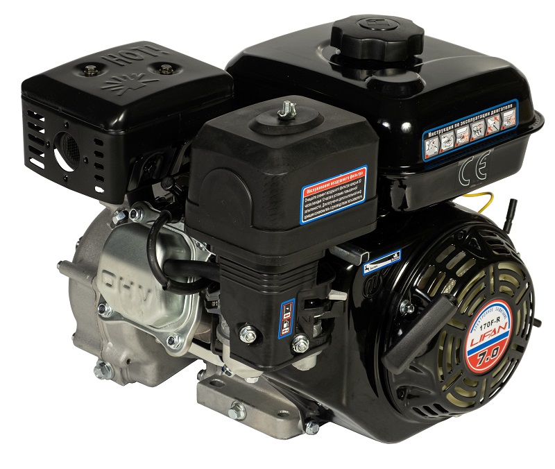 Бензиновый двигатель Lifan 170F с катушкой 3 Ампера, разработан для установки на малую мототехнику бытового уровня. Наиболее хорошо подходит он для установки на культиваторы и мотоблоки, мотобуксировщики, мотопомпы, генераторы и другую технику. Эта модель сочетает в себе долговечность, экономичность с умеренной стоимостью и простотой в использовании. Дополнительно установлена катушка освещения 3 Ампера (40 Ватт), что дает возможность подключать дополнительно полезную нагрузку до 40 Ватт. Это четырехтактный одноцилиндровый двигатель внутреннего сгорания. Рабочий объем цилиндра составляет 212 кубических сантиметров, номинальная мощность достигает 5,7 лошадиных сил, а максимальная может достигать 7 лошадиных сил. Диаметр цилиндра и тип газораспределительного механизма позволяют обеспечить компактные размеры двигателя, он свободно устанавливается на многие модели малой сельскохозяйственной техники. В качестве топлива эта модель использует широко распространенный автомобильный бензин марки АИ-92, потому проблем с горючим не возникнет. Коленчатый вал имеет горизонтальное расположение, это также способствует небольшим размерам, а кроме того существенно упрощает конструкцию и монтаж силового агрегата на шасси. Крутящий момент достигает 1,3 Н.м при 3600 оборотов в минуту, при этом сохраняется высокая стабильность работы и небольшой расход бензина. Емкость топливного бачка равна 3,6 литрам, одной заправки достаточно для длительной непрерывной работы. В качестве смазки используется доступное и известное каждому автомобилисту моторное масло 10х30, 10х40 для одной заправки маслом требуется не более 0.6 литра. Транзисторная система зажигания проста в обслуживании и долговечна, она способствует стабильной работе двигателя при любых условиях. Двигатель Lifan 170F обладает массой в 16 килограммов, это легковесный и компактный агрегат, он способен обеспечить высокую продуктивность работы при минимальных затратах и потерях. Его простая конструкция не создаст проблем при установке или при обслуживании, использование эффективного воздушного охлаждения позволяет активно использовать мотор даже в жаркую погоду, удобный пусковой тросик обеспечивает легкий запуск двигателя. Преимущества двигателя Lifan 170F (ДБГ-7): -Двигатель 4х тактный, одноцилиндровый, OHV, горизонтальный вал, воздушное охлаждение. -Зажигание электронное. -Система запуска ручной старт. -Легкий пуск система декомпрессии. -Продуманная конструкция малый вес и габариты. -Катушка освещения 3 Ампера (40 Ватт)