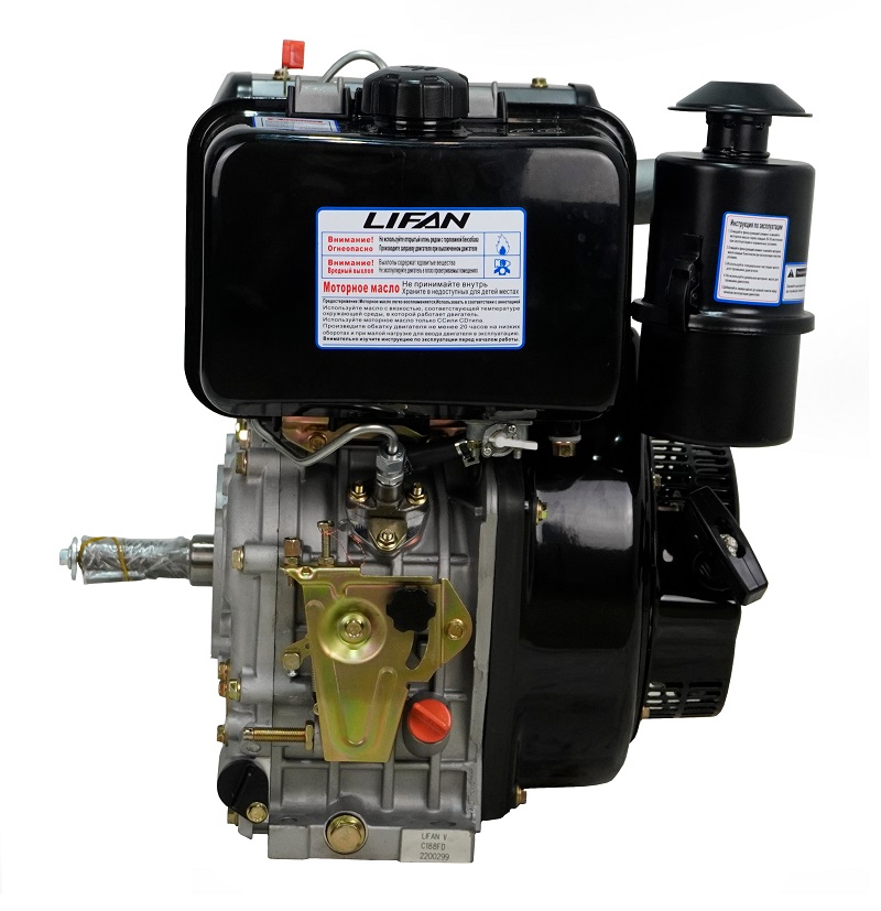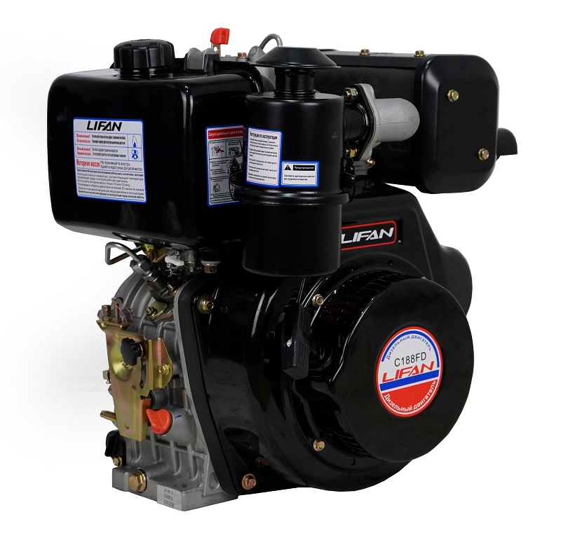 Дизельный двигатель Lifan 188FD разработан для установки на различную технику бытового применения. Эта модель сочетает в себе долговечность, экономичность с умеренной стоимостью и простотой в использовании. Двигатель оснащен катушкой освещения на 6 Ампер и выпрямителем-стабилизатором, что позволяет подключить полезное электрооборудование мощностью до 80 Ватт и полноценно подзаряжать аккумуляторную батарею. Это четырехтактный одноцилиндровый дизельный двигатель с воздушным охлаждением. Рабочий объем цилиндра составляет 456 кубических сантиметров. Диаметр цилиндра и тип газораспределительного механизма позволяют обеспечить компактные размеры двигателя. В качестве топлива эта модель использует широко распространенное дизельное топливо, поэтому проблем с горючим не возникнет. Коленчатый вал имеет горизонтальное расположение. Крутящий момент достигает 24,7 Н.м при 2880 оборотов в минуту, при этом сохраняется высокая стабильность работы и небольшой расход топлива. Емкость топливного бака равна 5,5 л, одной заправки достаточно для длительной непрерывной работы. В качестве смазки используется доступное и известное каждому автомобилисту моторное масло 10х30, 10х40 для одной заправки маслом требуется не более 1,65 л. Двигатель Lifan 188FD обладает массой в 48 килограмм. Его простая конструкция не создаст проблем при установке или при обслуживании, использование эффективного воздушного охлаждения позволяет активно эксплуатировать мотор даже в жаркую погоду, удобный пусковой тросик и система декомпрессии, обеспечивают легкий запуск двигателя в любое время года. Преимущества двигателя Lifan 188FD : -Двигатель 4х тактный, одноцилиндровый, OHV, горизонтальный вал, воздушное охлаждение. -Система запуска ручной и электрический стартер. -Оборудован катушкой освещения 6 Ампер, что позволяет подключать к нему электрическую нагрузку мощностью до 80 Ватт -Легкий пуск, благодаря системе декомпрессии. -Продуманная конструкция малый вес и габариты.
